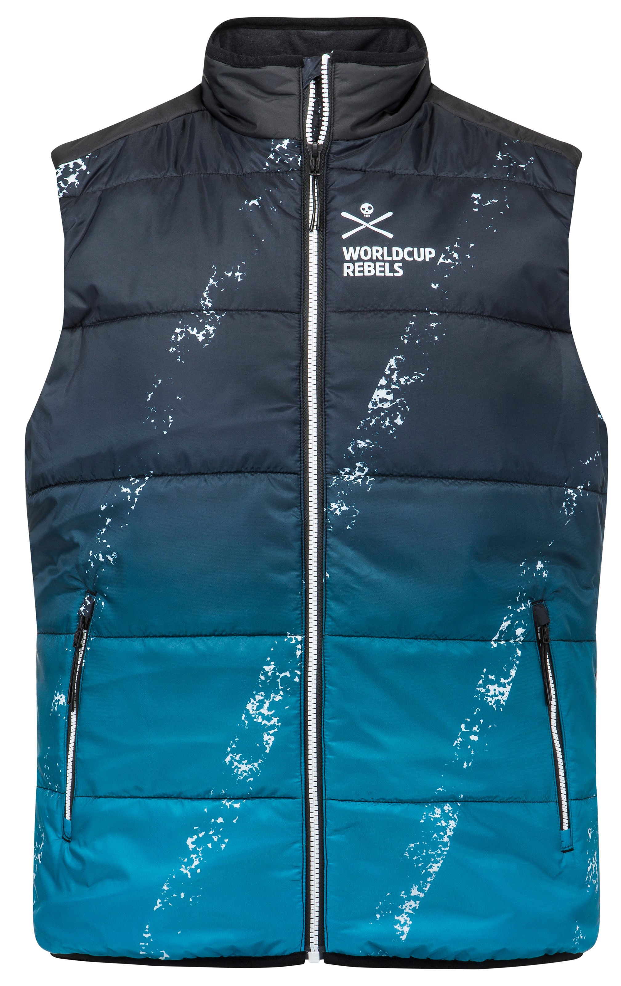 RACE STAR VEST MEN to nowoczesny sportowy styl, który sprawdzi się zarówno w górach, jak i na miejskich ulicach. Kamizelkę wyróżniają ukośne paski, kultowe logo World Cup Rebels oraz cieniowany nadruk inspirowany zmieniającymi się kolorami morza. Model wykonano z lekkiego poliestrowego materiału ripstop z hydrofobowym wykończeniem DWR i wypełniono poliestrem 180 g zapewniającym ciepło. Kurtka ma przednie zapięcie z zamkiem YKK® Flat VISLON® z osłoną podbródka. Całość dopełniają kieszenie na dłonie z zamkiem YKK® Flat VISLON®, wewnętrzna kieszeń na sprzęt elektroniczny z zamkiem YKK® oraz miękkie i elastyczne podszycie otworów na ramiona i dolnej części.