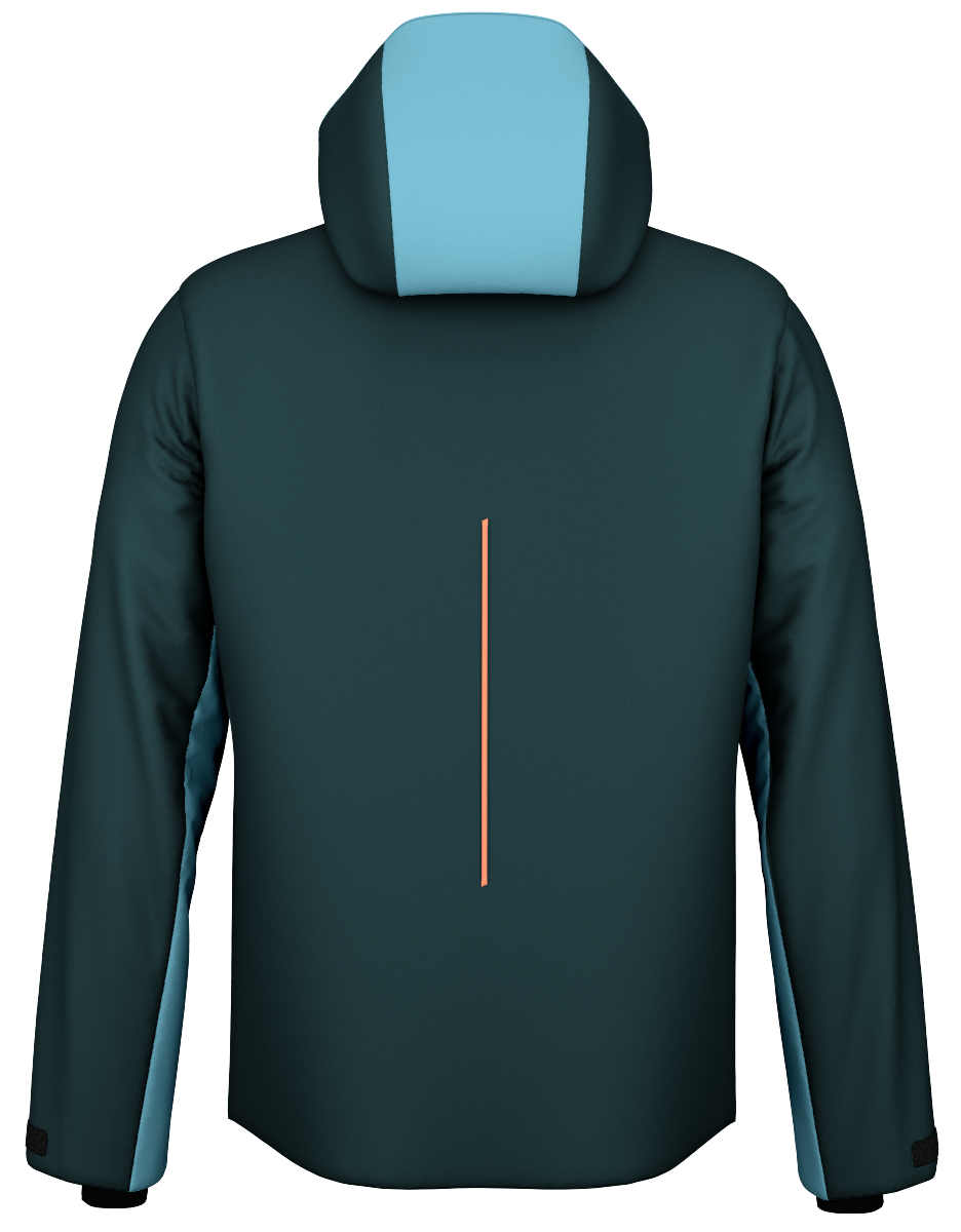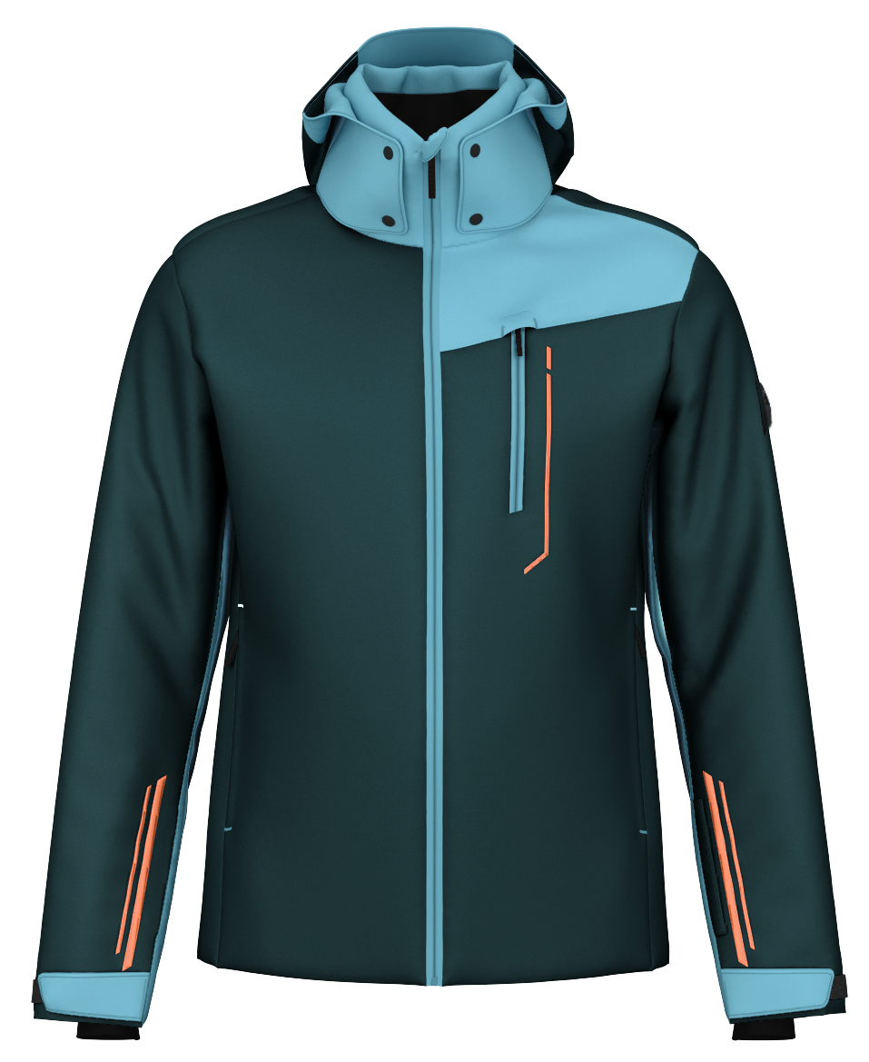 - Kieszenie na dłonie, kieszonka na skipass, odpinany kaptur i wewnętrzna kieszeń na piersi z zamkami SAB®