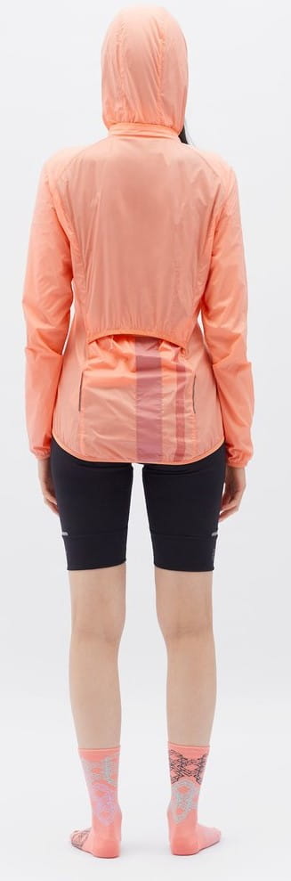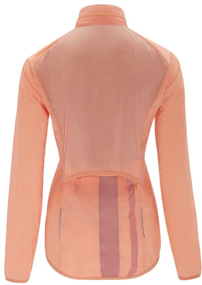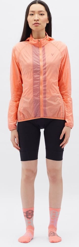 Gela to damska kurtka rowerowa z pełnym zamkiem błyskawicznym wykonana z oddychającego i lekkiego materiału Windbreaker WR, który jest również odporny na wiatr. Kurtka ma lekko rozkloszowany krój, przedłużony tył z wentylacją oraz wentylację na boczne zamki błyskawiczne w pachach. Na plecach znajduje się kieszeń na zamek, ozdobne elementy odblaskowe oraz kaptur schowany w kołnierzu. Rękawy wykończone są elastycznym mankietem.