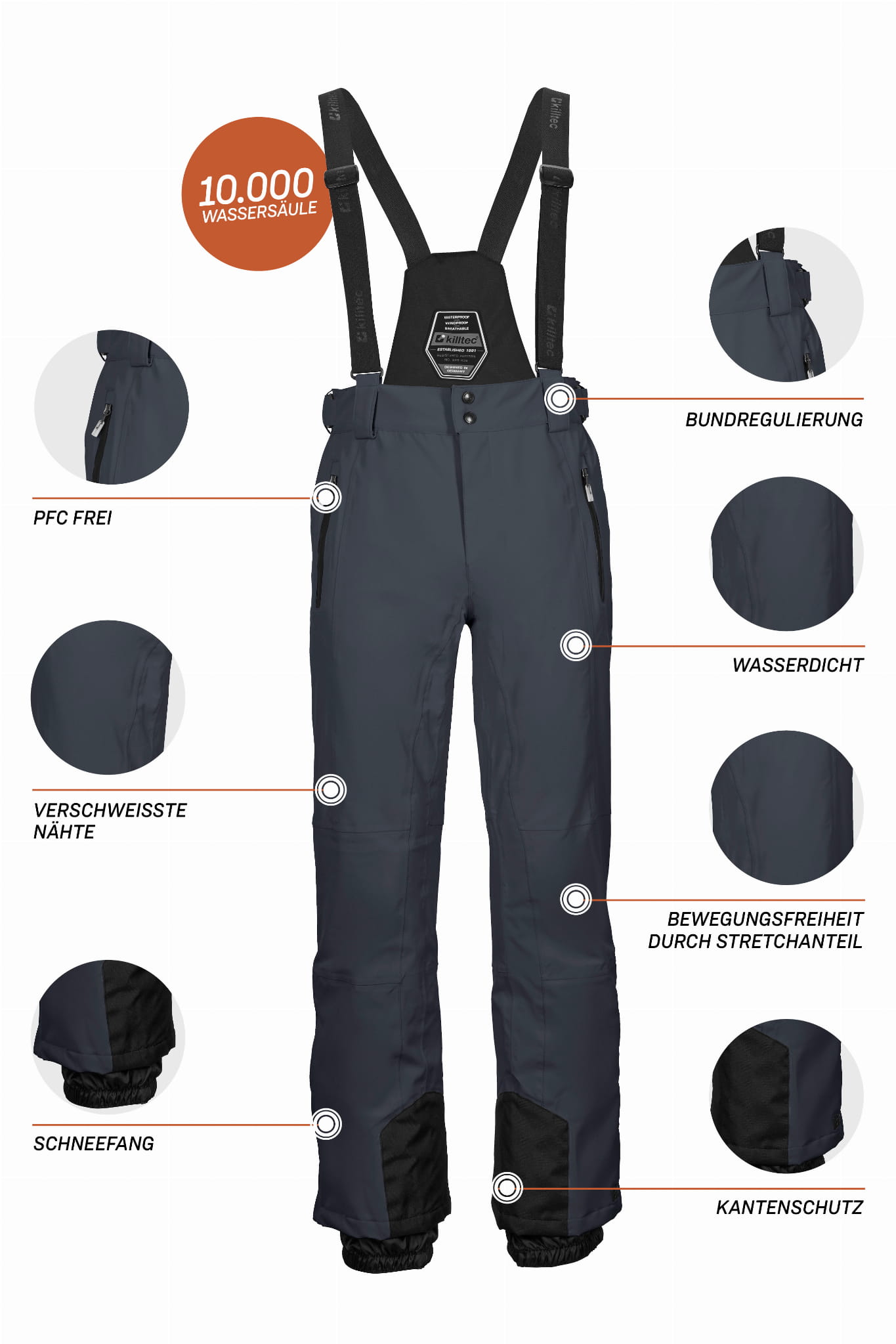 Spodnie narciarskie dla aktywnego narciarza, poszukującego spodni nieprzemakalnych oraz oddychających, a przy tym wygodnych i modnych. Spodnie Killtec Enosh zapewniają optymalną termoregulację oraz skuteczną ochronę przed śniegiem, wodą czy deszczem. Dzięki temu ich użytkowanie będzie jeszcze większą przyjemnością. Spodnie wyposażone zostały w wiele zastosowań, które spełnią oczekiwania najbardziej wymagających miłośników sportów zimowych. Regulowane i odpinane szelki oraz regulowana talia z przedłużonym tyłem , pozwala w niebywały sposób dopasować się do pasa. Dzięki specjalnie profilowanym kolanom produkt świetnie będzie wyglądał na naszych nogach. Wewnątrz spodni umieszczono stuptuty przeciwśnieżne, regulowane napami, które doskonale zabezpieczą stopy przed dostaniem się śniegu. Natomiast, dzięki ich elastycznemu zakończeniu z łatwością nasuniesz je na obuwie. Zastosowano również wewnętrzne wzmocnienia na nogawkach chroniące przed różnego rodzaju otarciami. Kieszenie boczne zapinane na suwak dają poczucie bezpieczeństwa, że nic z nich nie wypadnie ani się nie zamoczy podczas zabawy na śniegu. Spodnie Enosh są komfortowe i wygodne, a przy tym można wybierać w różnorodnej kolorystyce, która jest dostępna